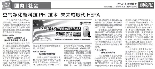 各大媒体对RGF空气净化器的报道