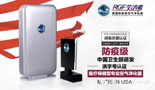 2011年,美国RGF防疫级空气净化器获得了卫生部的“消字号”证书,成为受中华人民共和国卫生部批准的,可杀灭或消除传播媒介上的病原微生物的消毒器械(防疫)。